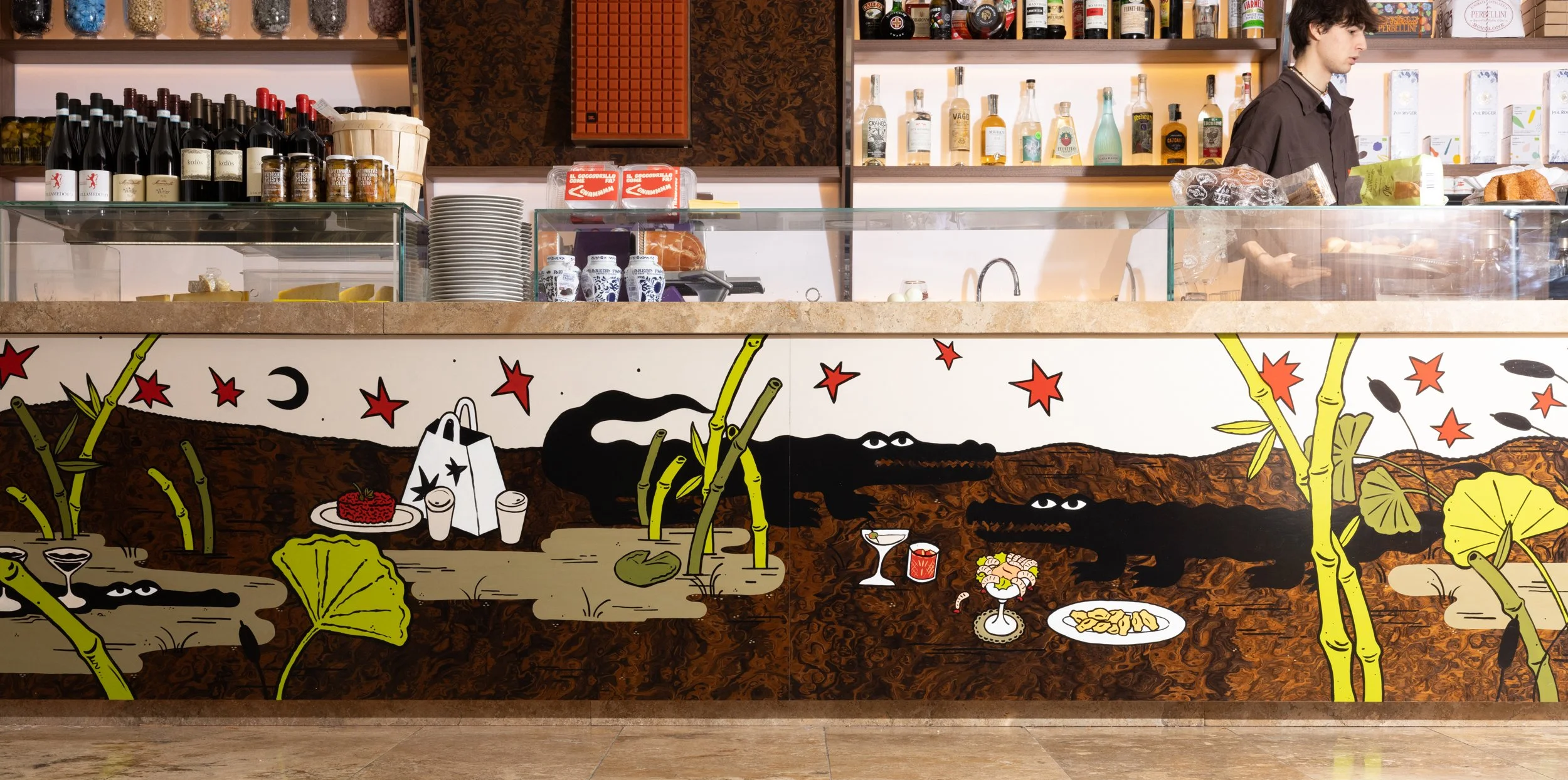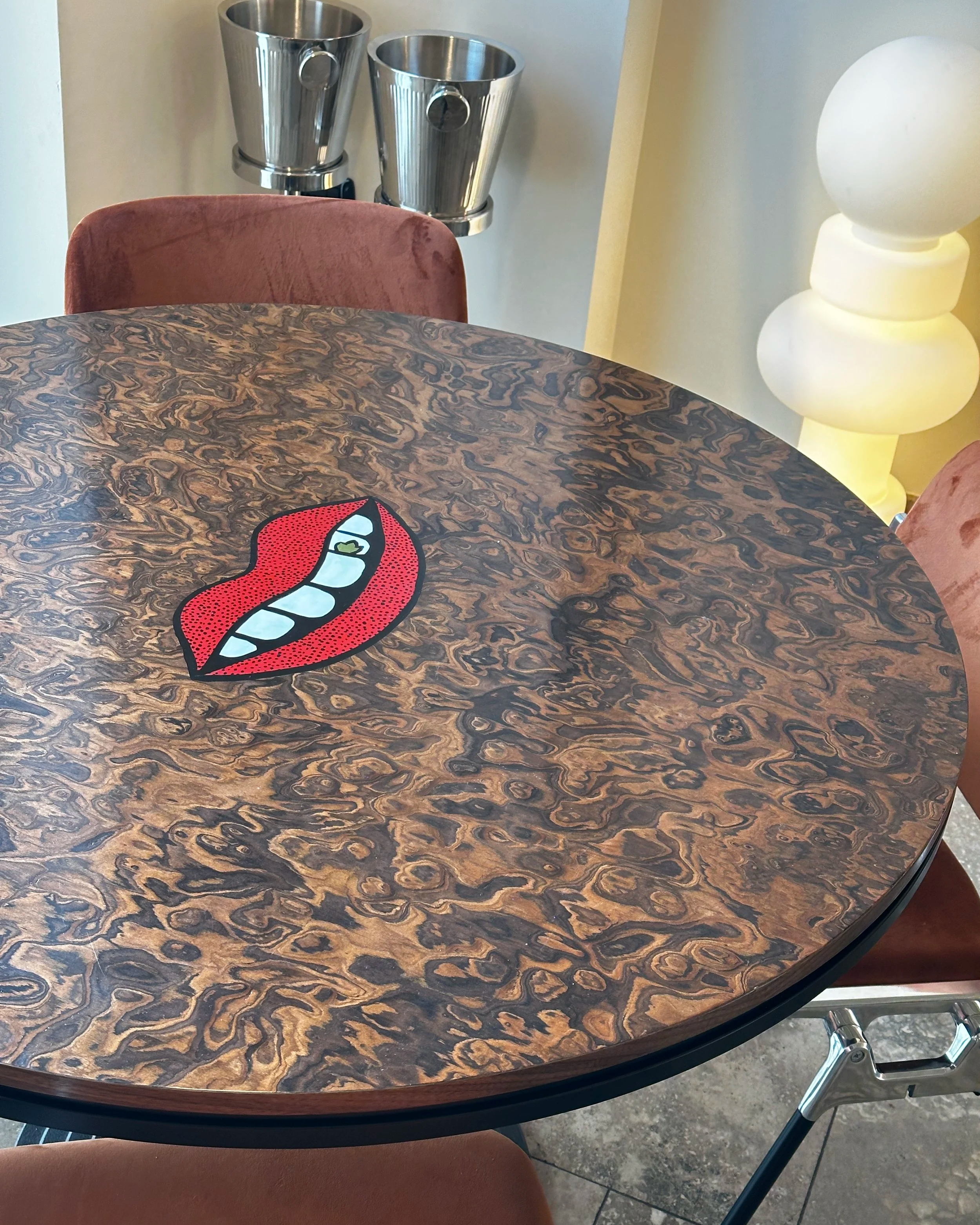 Come ultima cosa ho realizzato un dipinto di 5 metri che corre lungo tutto il bancone dell’ingresso e due tavoli in radica con l’iconica illustrazione della bocca col prezzemolo.